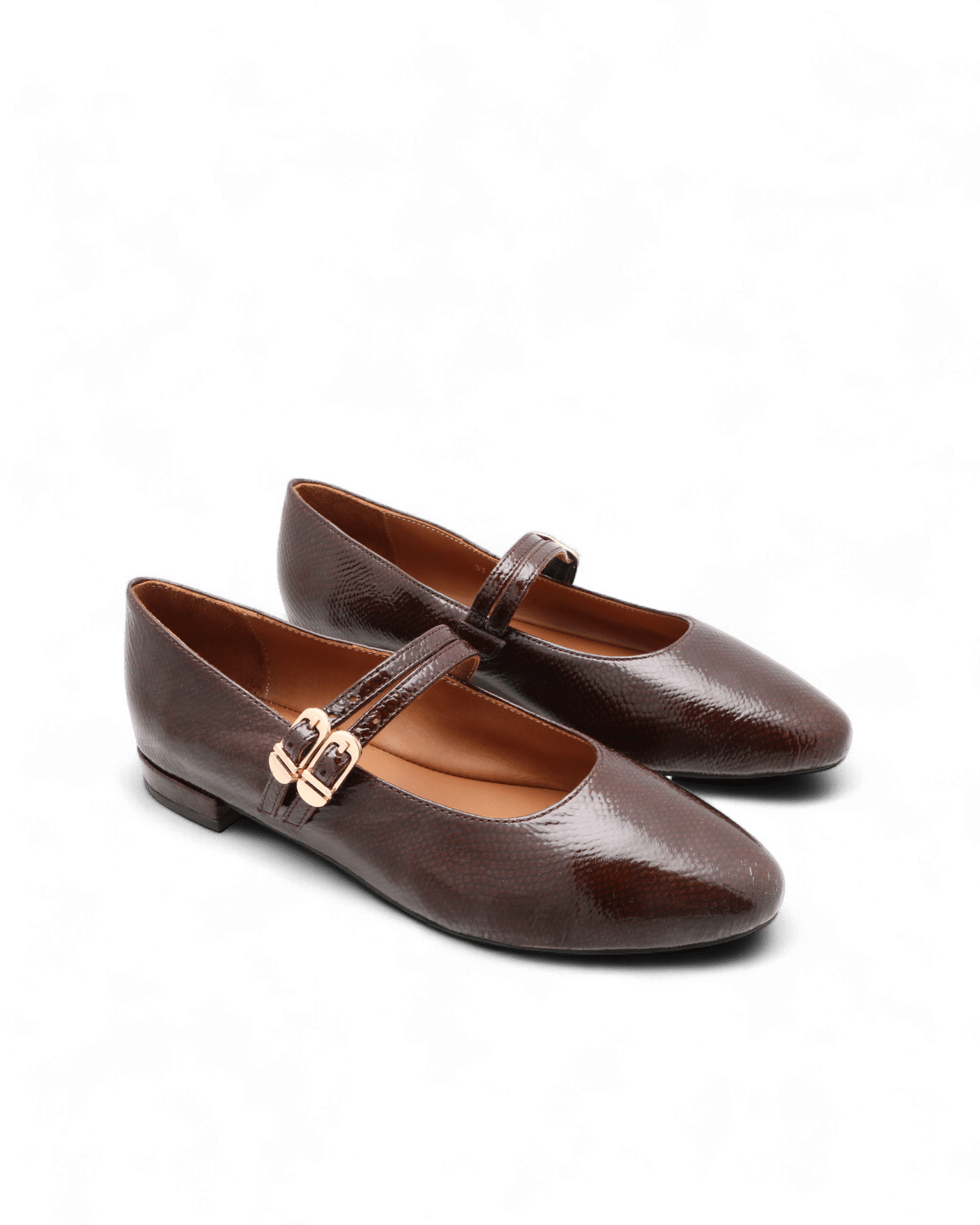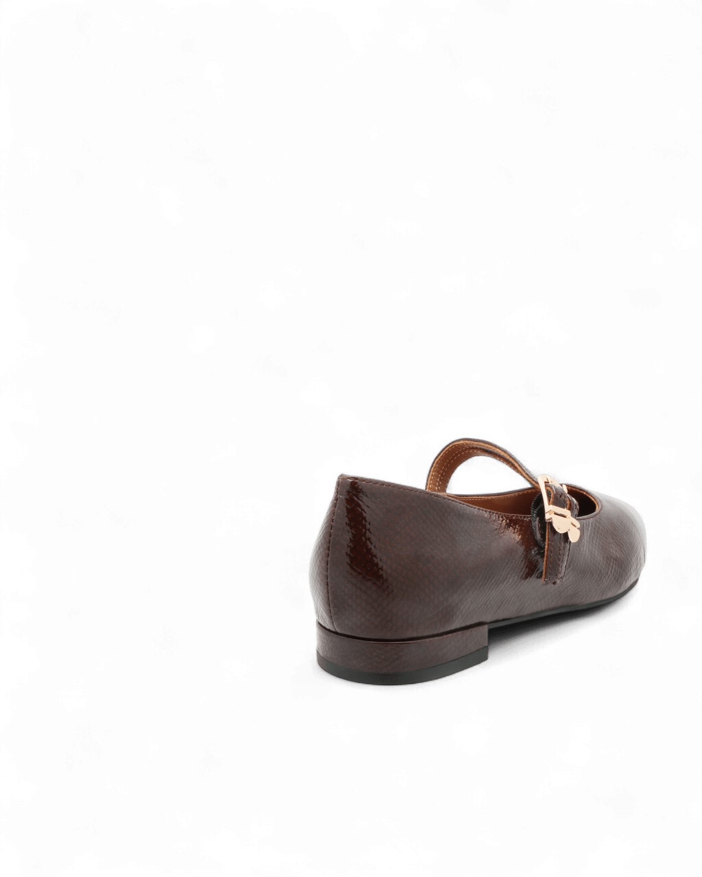 Confectionnées en cuir vernis texturé, ces babies captent la lumière avec subtilité. Leur teinte chocolat est profonde, chaleureuse et facile à assortir. Elle se marie aisément avec les tons d’automne comme le beige, le kaki, le bordeaux ou le bleu marine. Cela en fait une paire polyvalente, parfaite pour la saison.