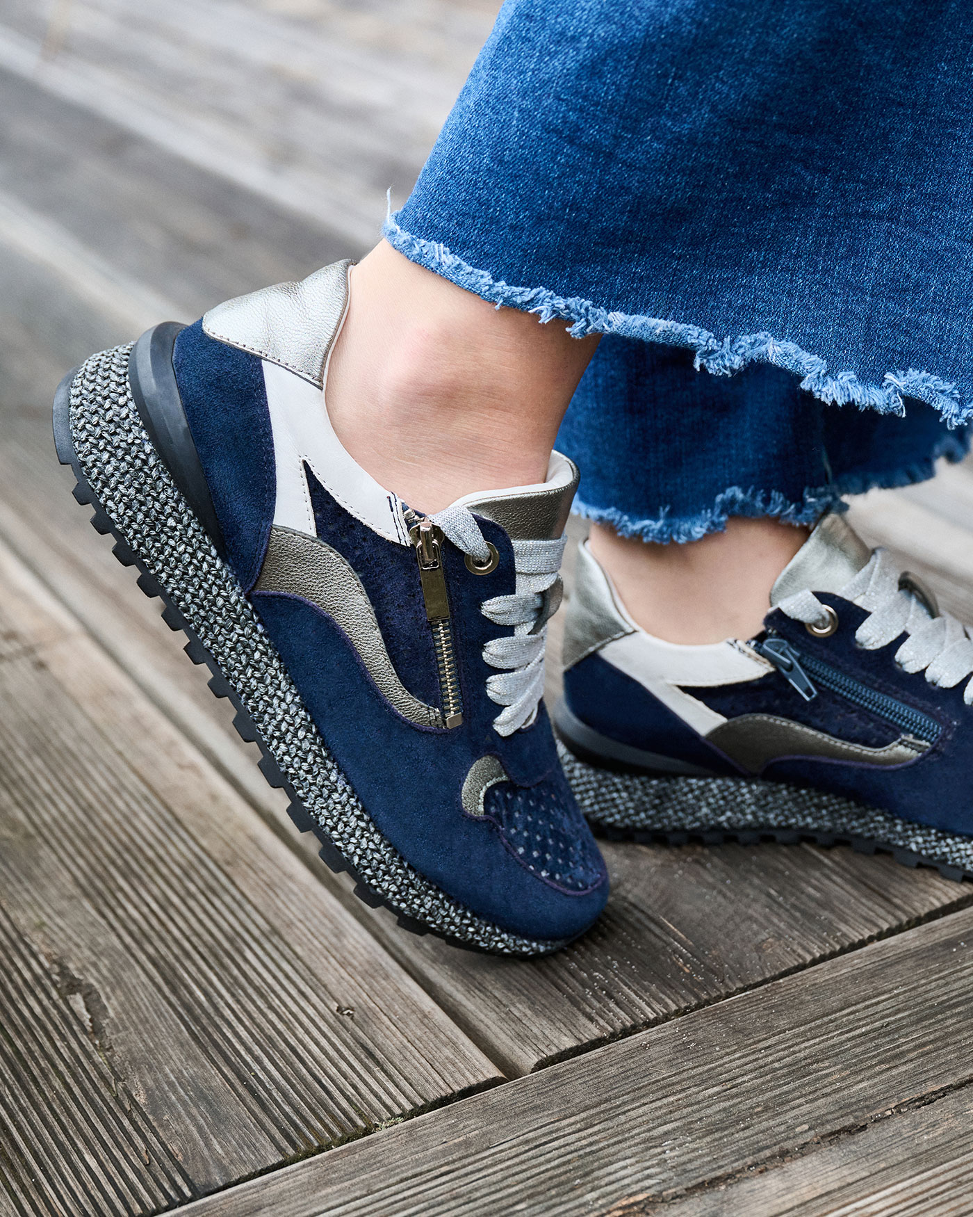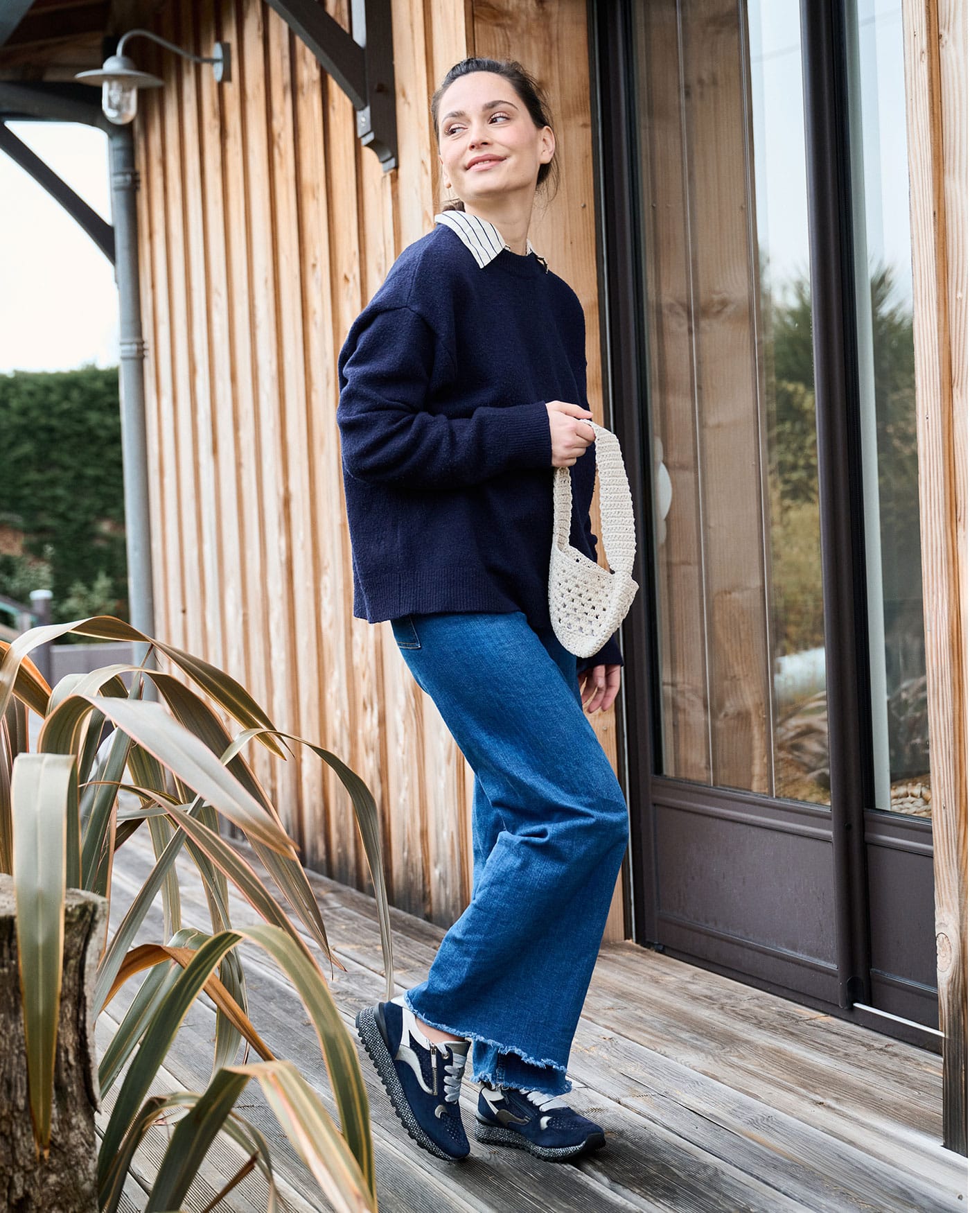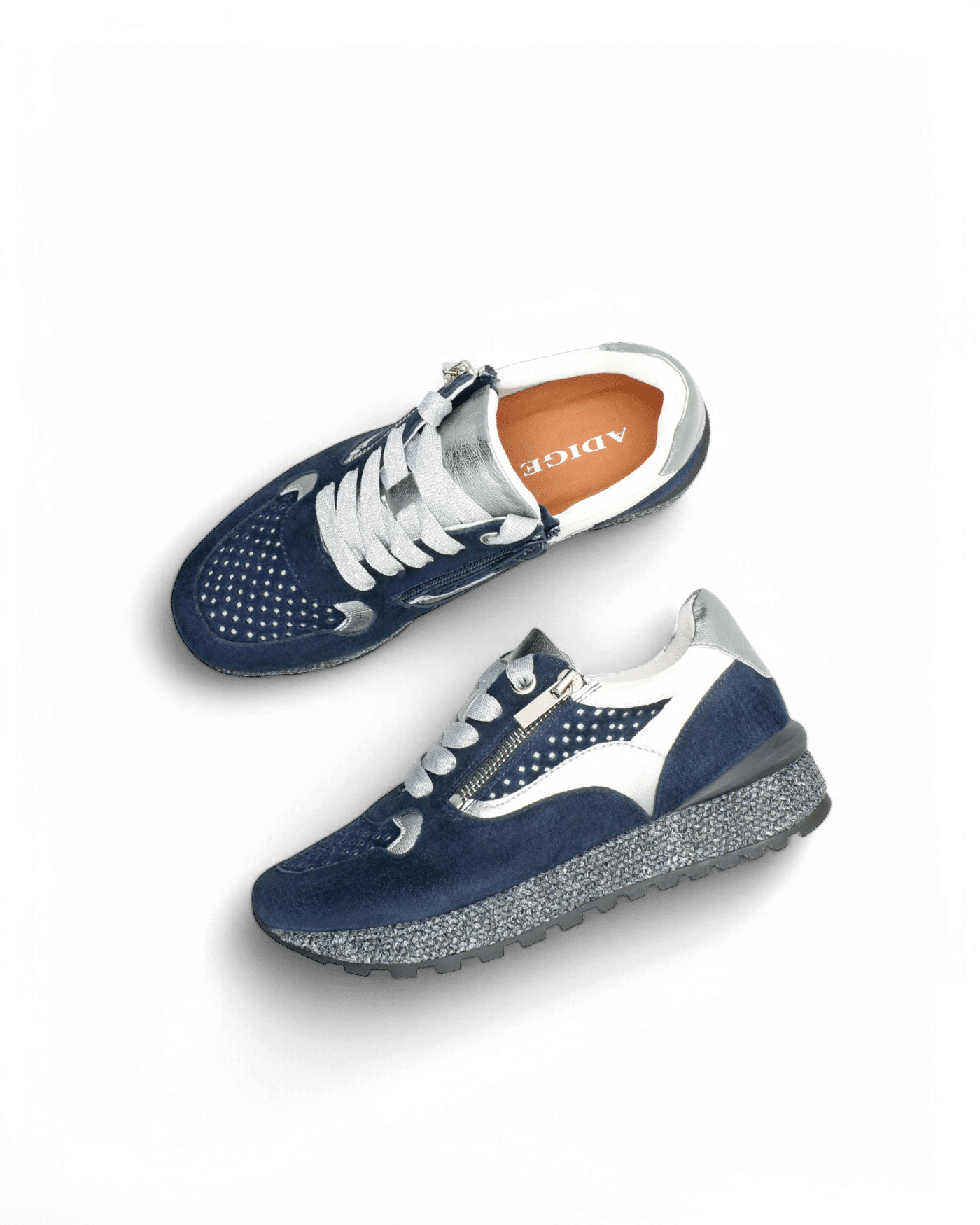 Le bleu marine, sobre et chic, confère à ces baskets une allure intemporelle. Il est donc facile à associer avec une grande variété de tenues. Pour un style casual-chic, associez-les à un jean large ou un pantalon en lin et un t-shirt ou une chemise. Elles s’accordent également parfaitement avec une jupe ou une robe d’été, ajoutant une touche décontractée mais raffinée à vos tenues plus féminines.