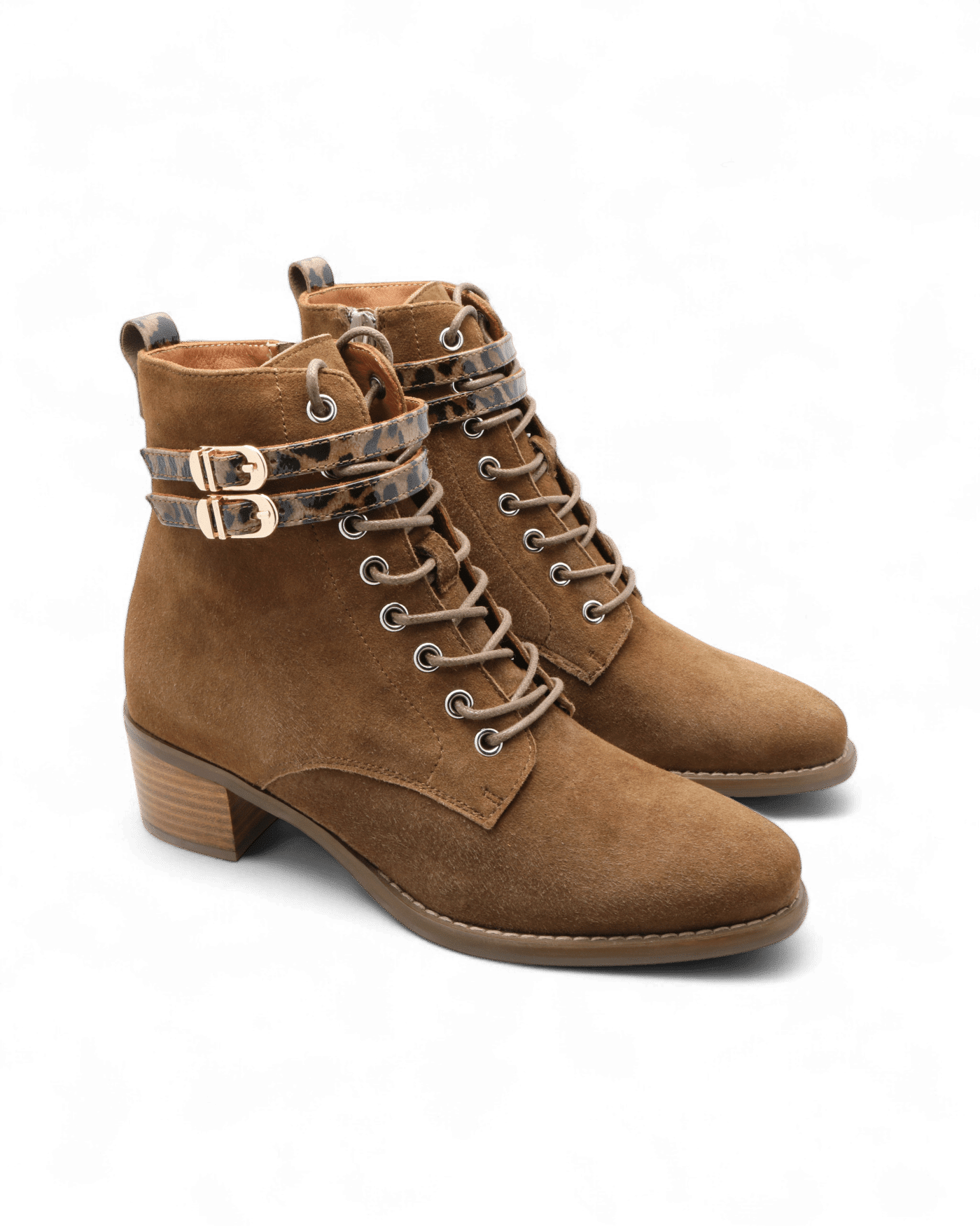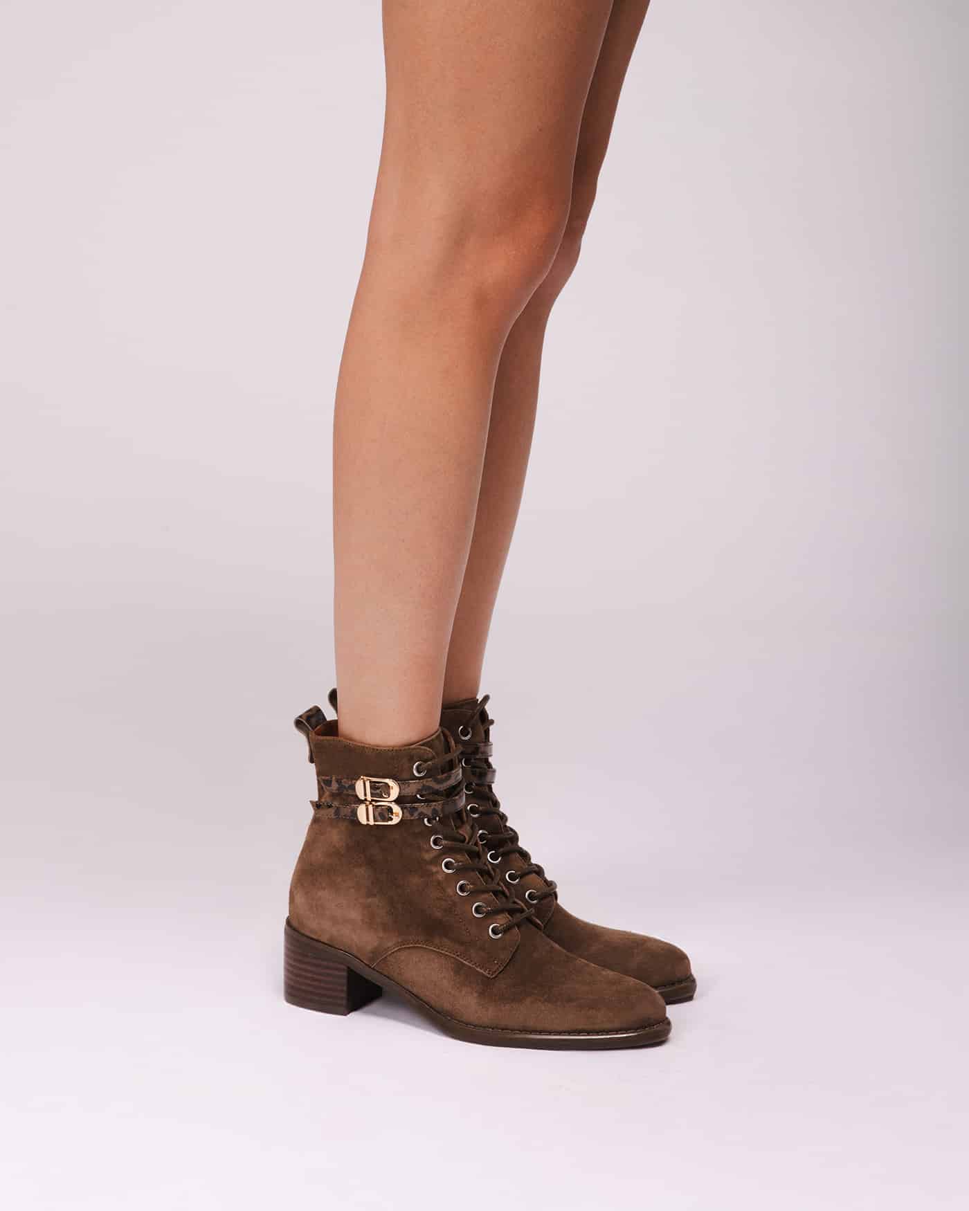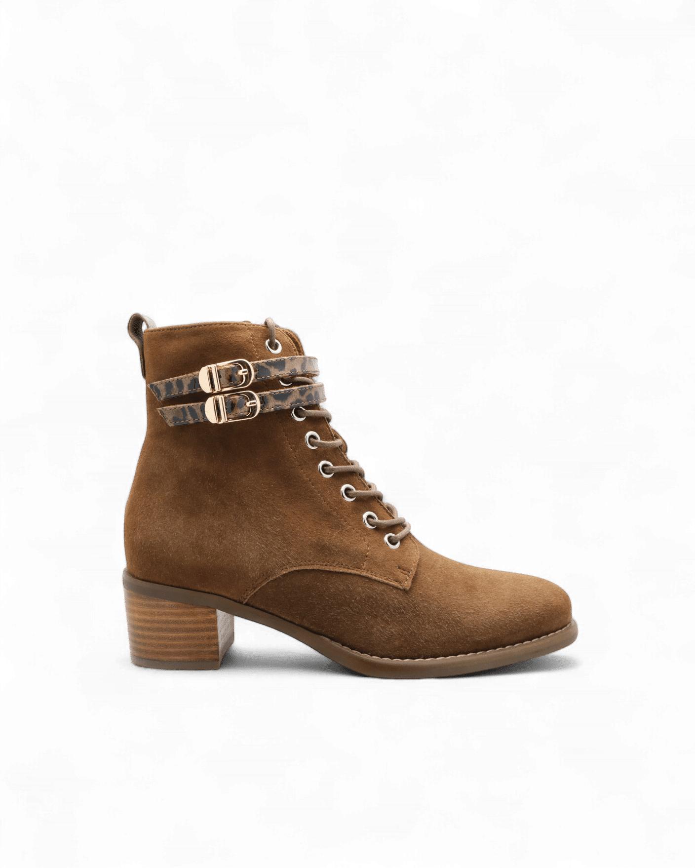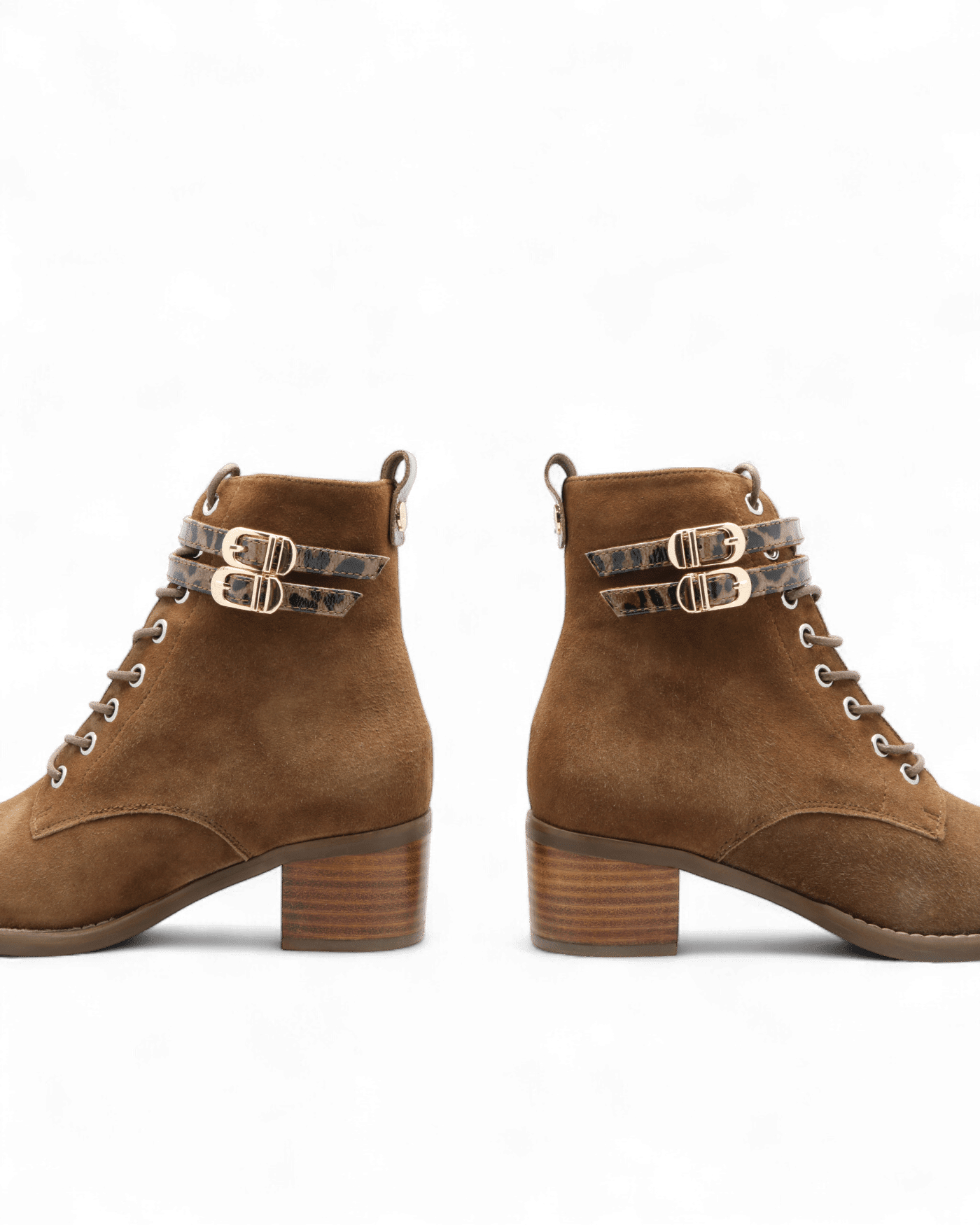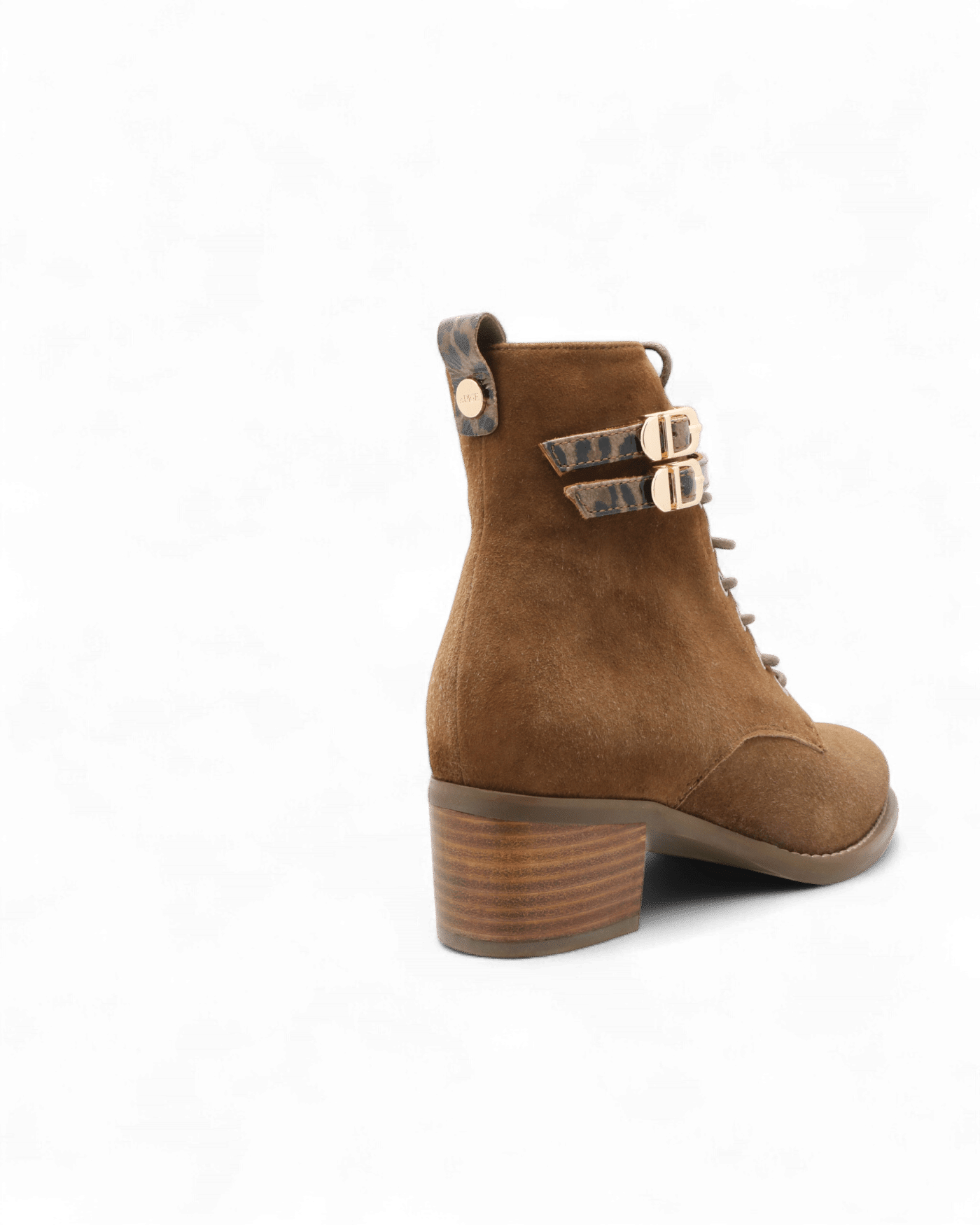 Confectionnée en daim souple de haute qualité, cette bottine a lacet se distingue par son coloris noix lumineux. Celui-ci s’intègre facilement à une garde-robe automne-hiver, car il s’accorde aussi bien avec des teintes naturelles comme le crème ou le brun qu’avec des couleurs plus contrastées comme le kaki ou le noir. En outre, son laçage délicat, rehaussé de deux brides à boucle dorée subtilement imprimées, apporte une touche de fantaisie tout en assurant un bon maintien du pied.