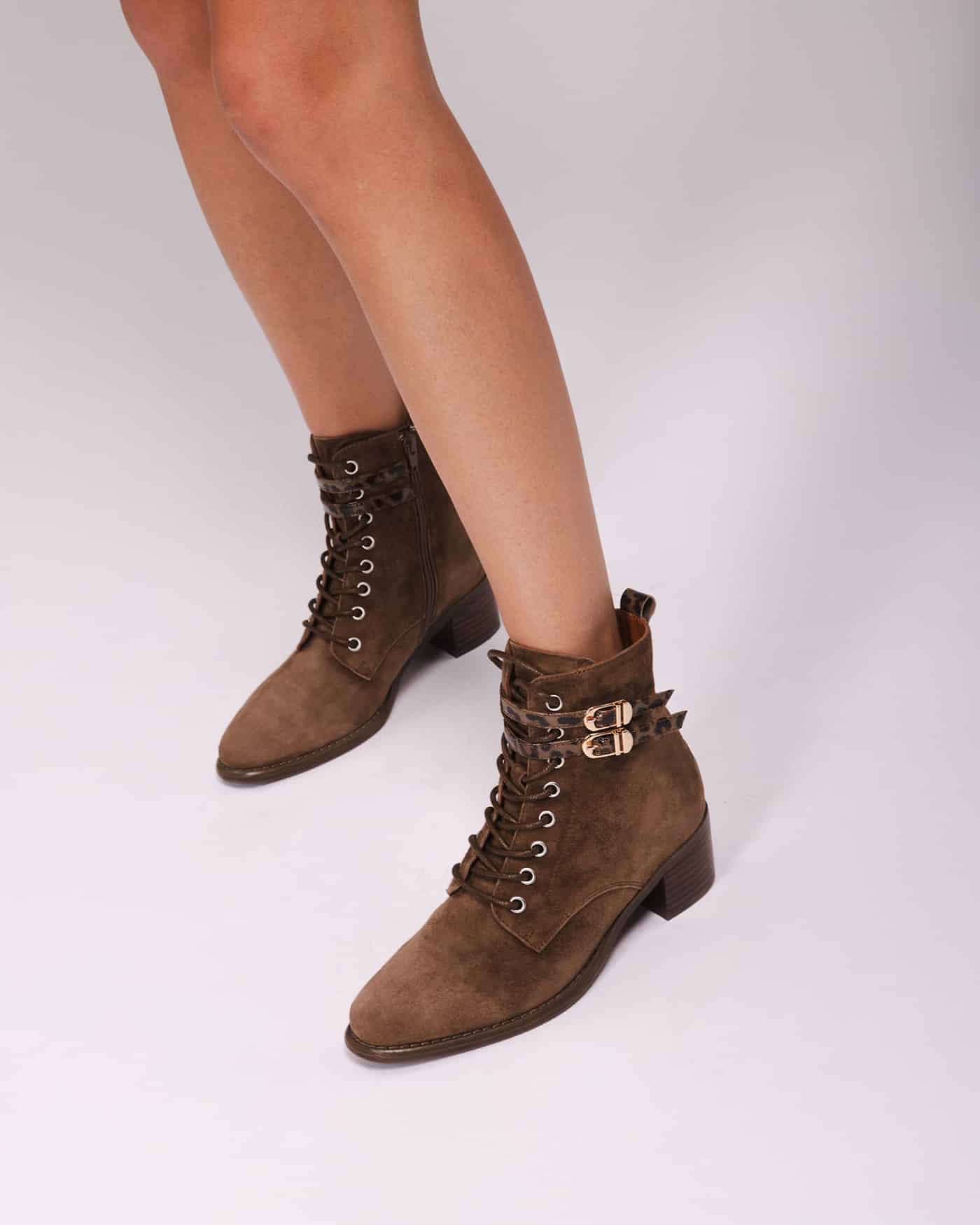 Pour un look urbain et élégant, associez la bottine a lacet Dora à un pantalon slim, une chemise fluide et un manteau droit en laine. Pour une silhouette plus douce, optez pour une robe pull beige ou une jupe midi plissée dans des tons chauds. Grâce à son coloris noix lumineux, elle apporte facilement de la chaleur à une tenue plus sobre. Enfin, n’hésitez pas à l’associer à des accessoires dorés pour rappeler les détails des boucles. Pensez à imperméabiliser le daim régulièrement afin de préserver la beauté et la tenue de la matière tout au long de la saison.