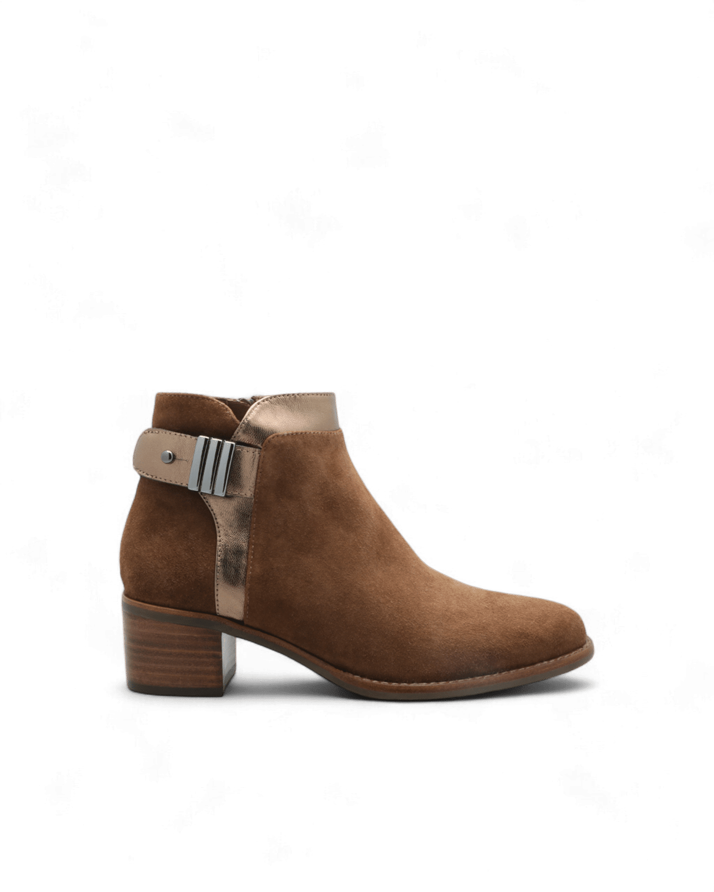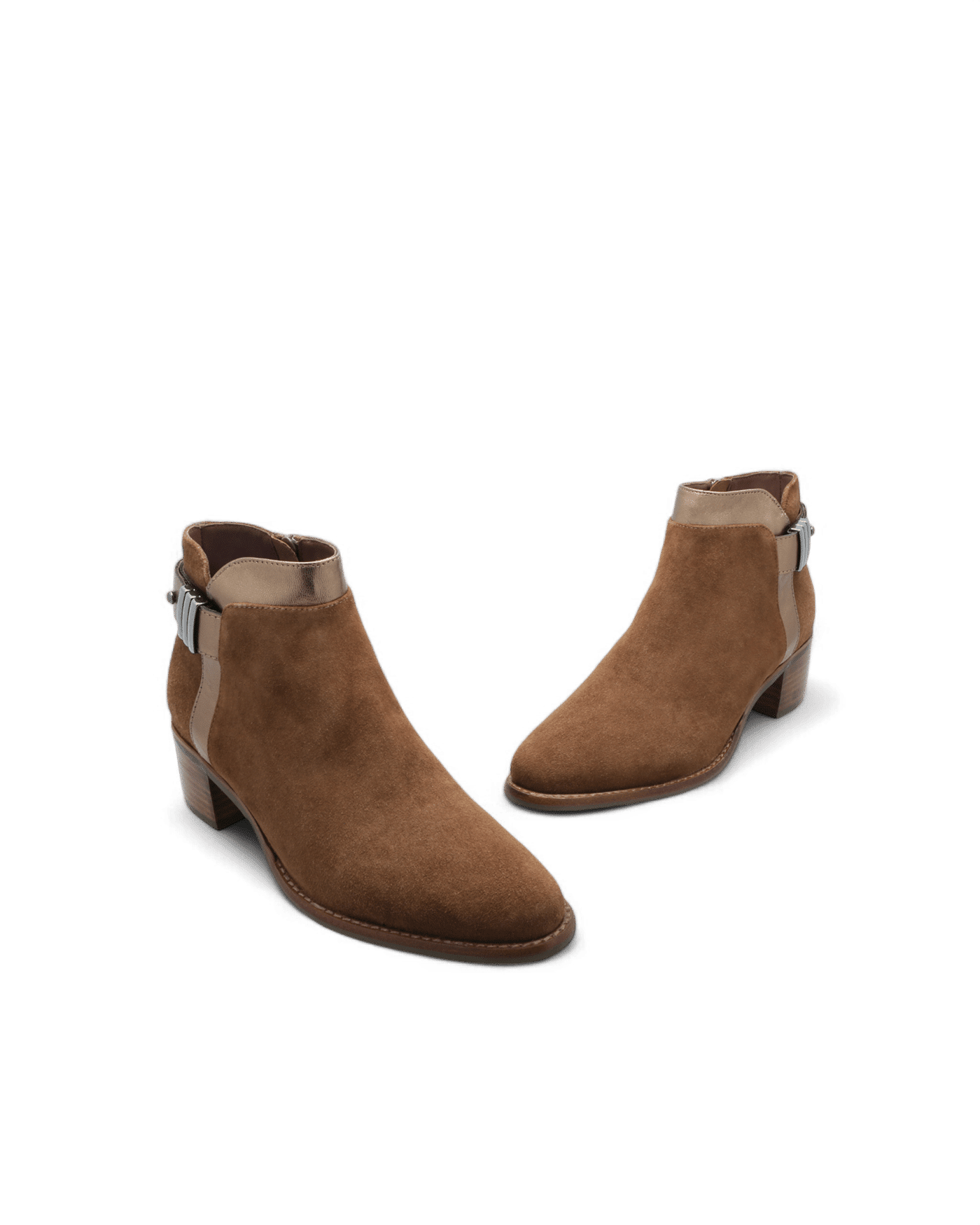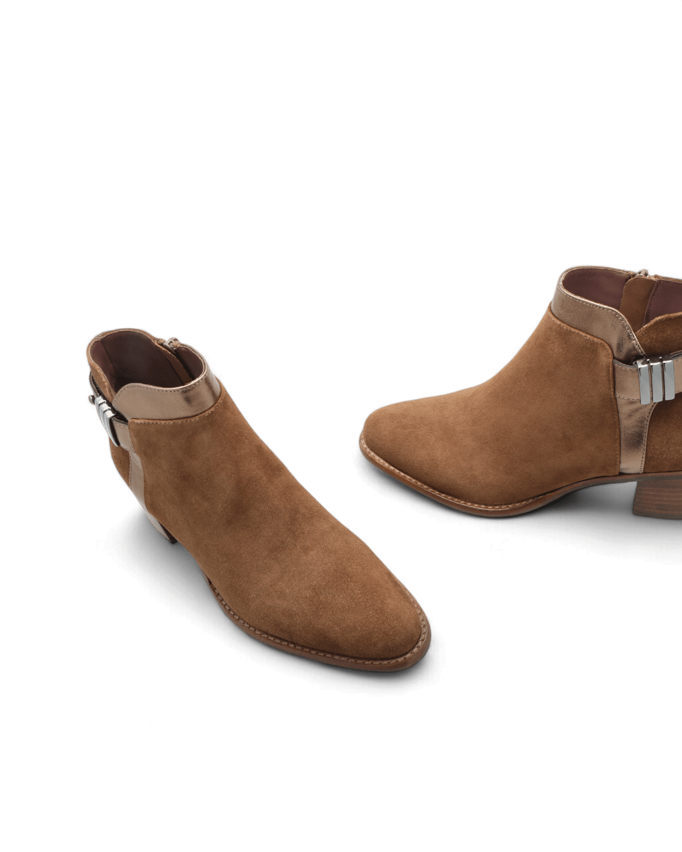 Adoptez la bottine en daim marron femme Derry qui est l’incarnation parfaite du style, du féminin et du confort. Confectionnées avec un cuir daim marron de haute qualité, ces bottines arborent des détails dorés subtils qui ajoutent une touche d’éclat à votre démarche. Un fin liseré de couleur or entoure la tige de la chaussure et une boucle dorée habille le côté extérieur de la chaussure pour apporter une touche féminine à tous vos looks.