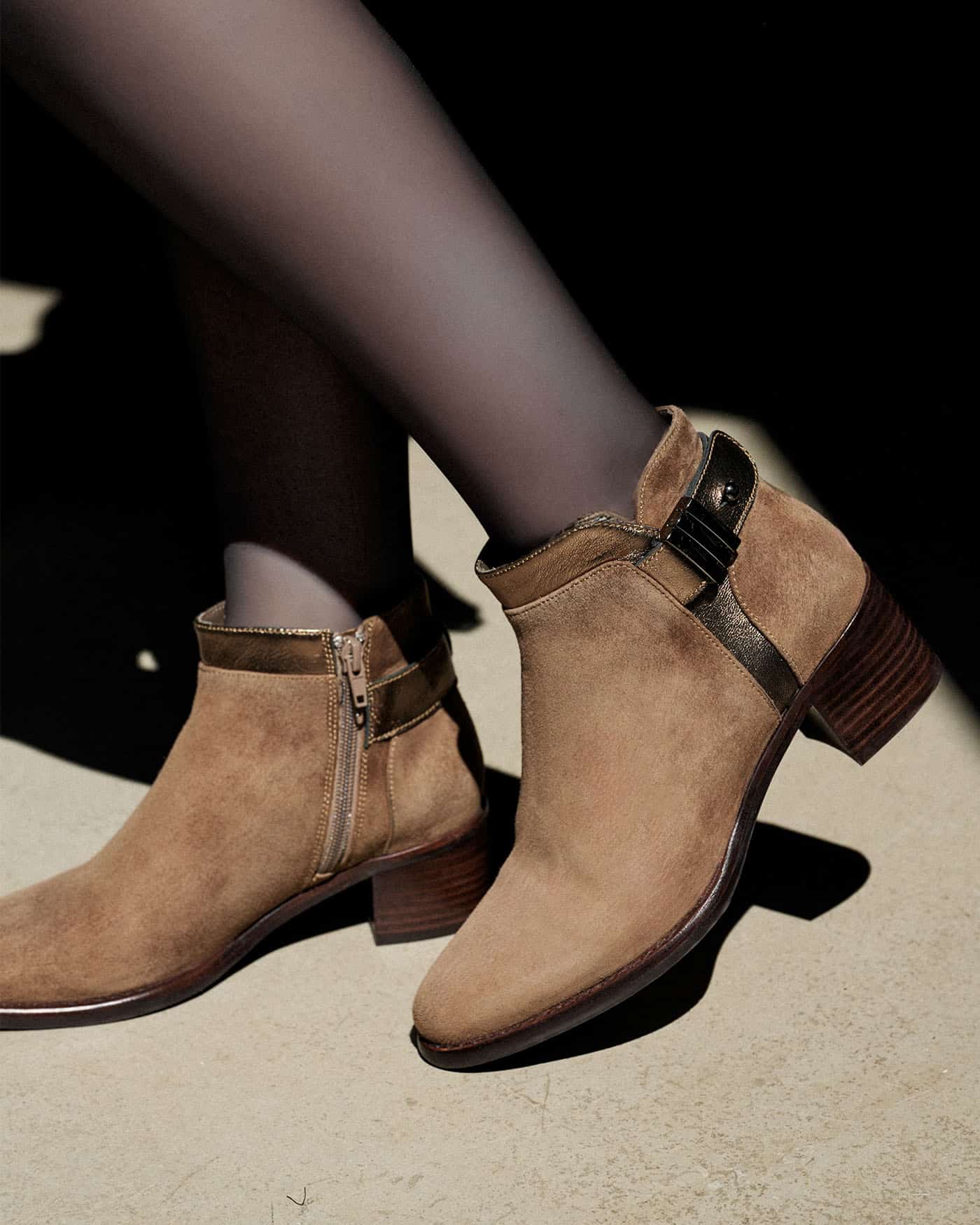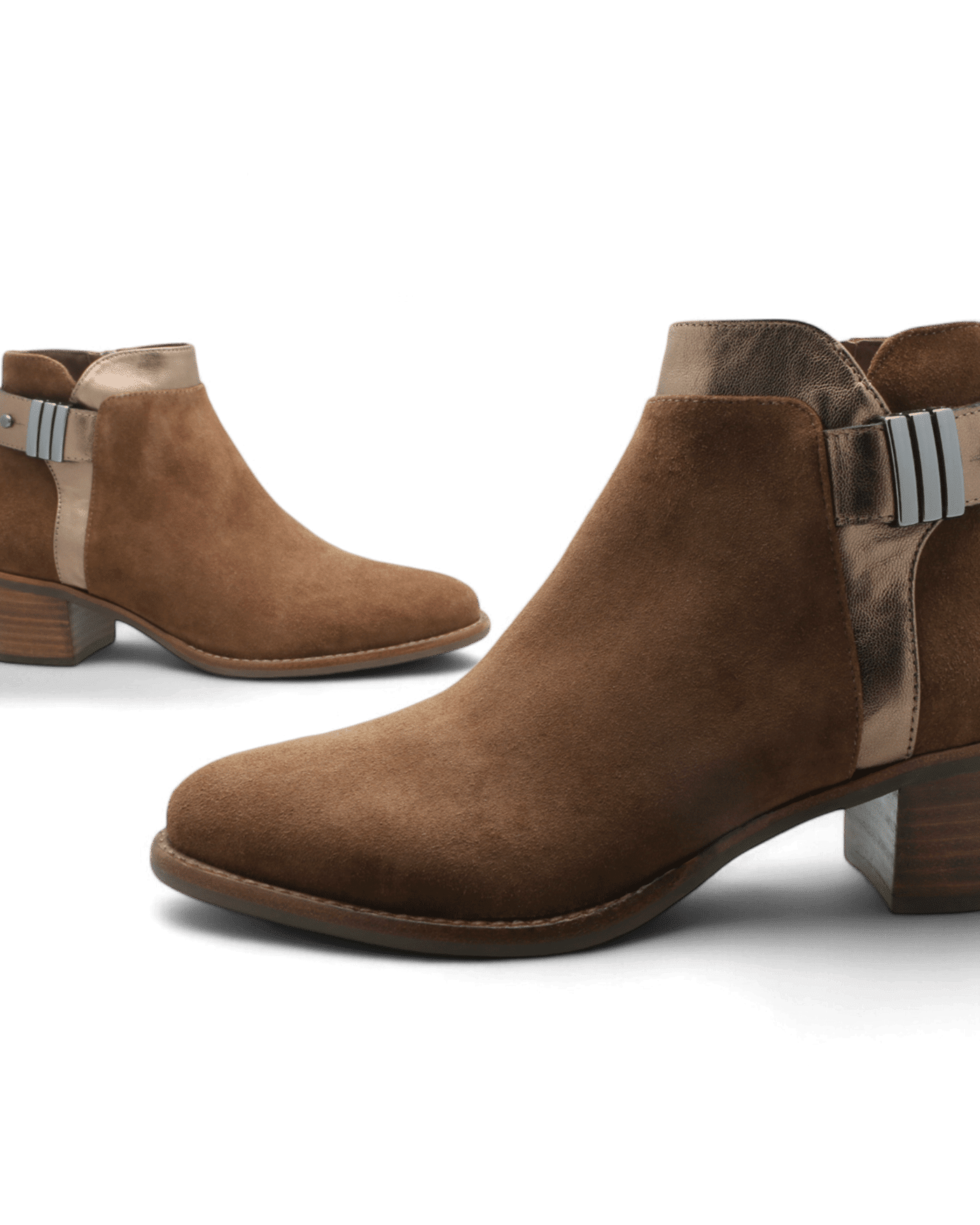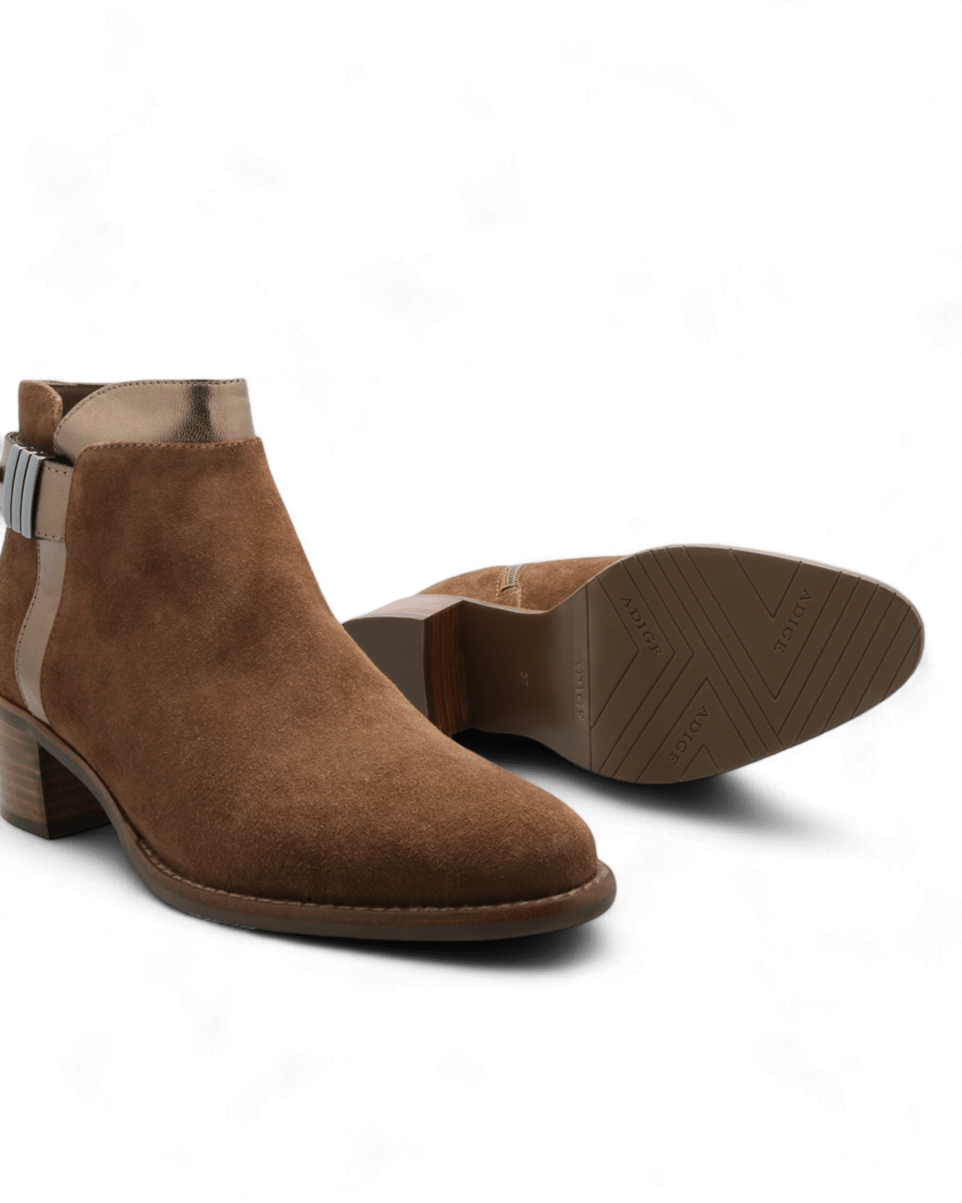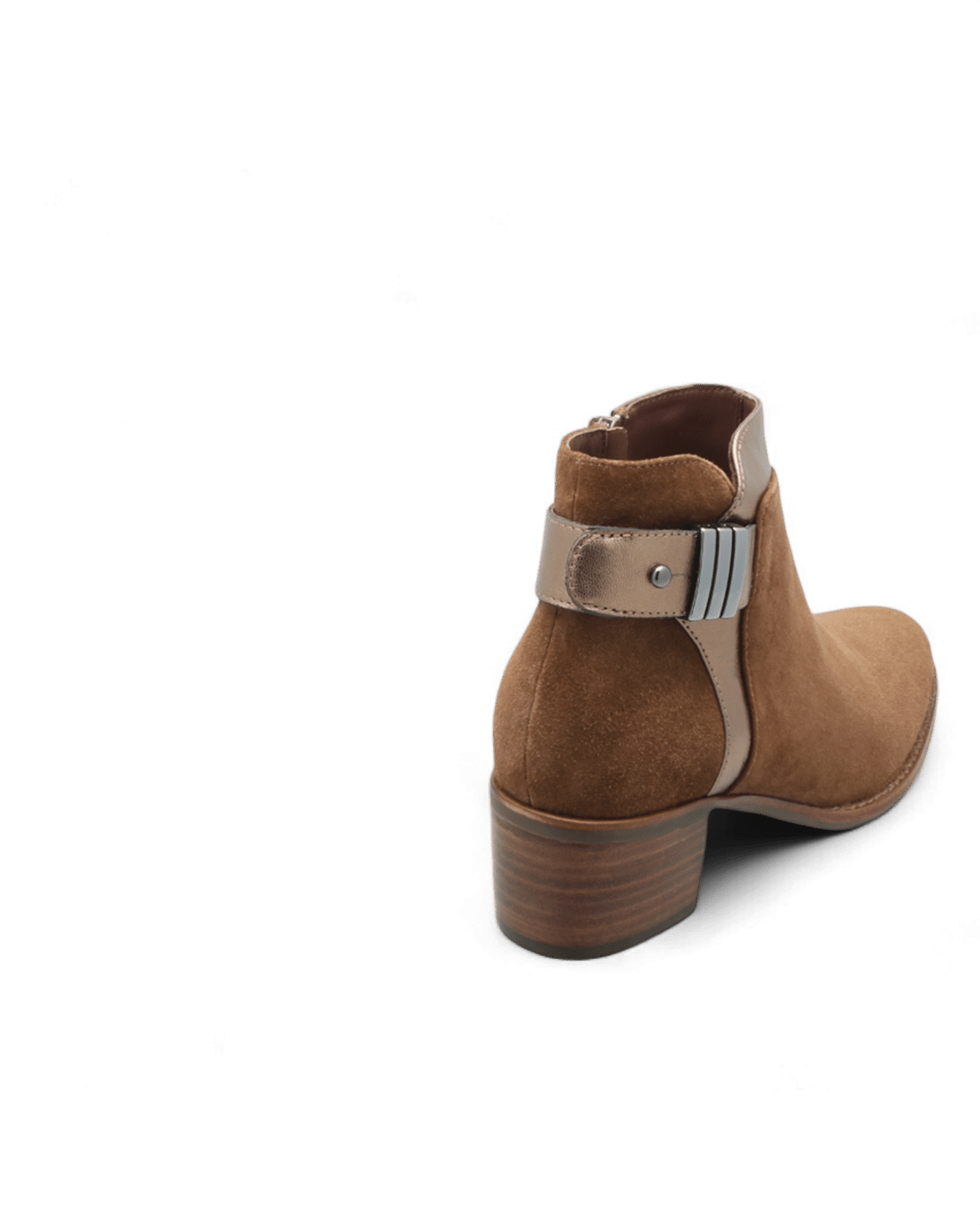 Adoptez la bottine en daim marron femme Derry qui est l’incarnation parfaite du style, du féminin et du confort. Confectionnées avec un cuir daim marron de haute qualité, ces bottines arborent des détails dorés subtils qui ajoutent une touche d’éclat à votre démarche. Un fin liseré de couleur or entoure la tige de la chaussure et une boucle dorée habille le côté extérieur de la chaussure pour apporter une touche féminine à tous vos looks.