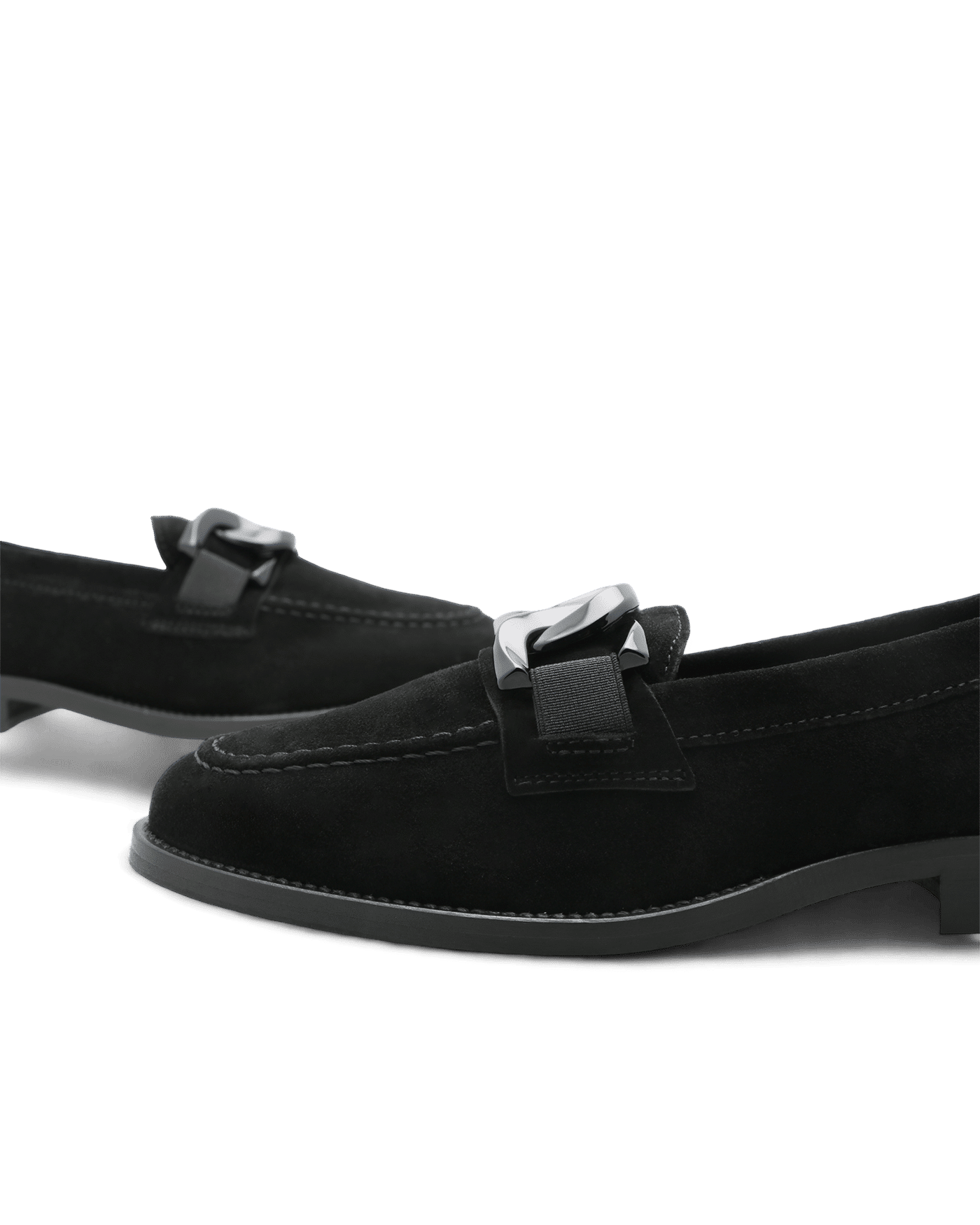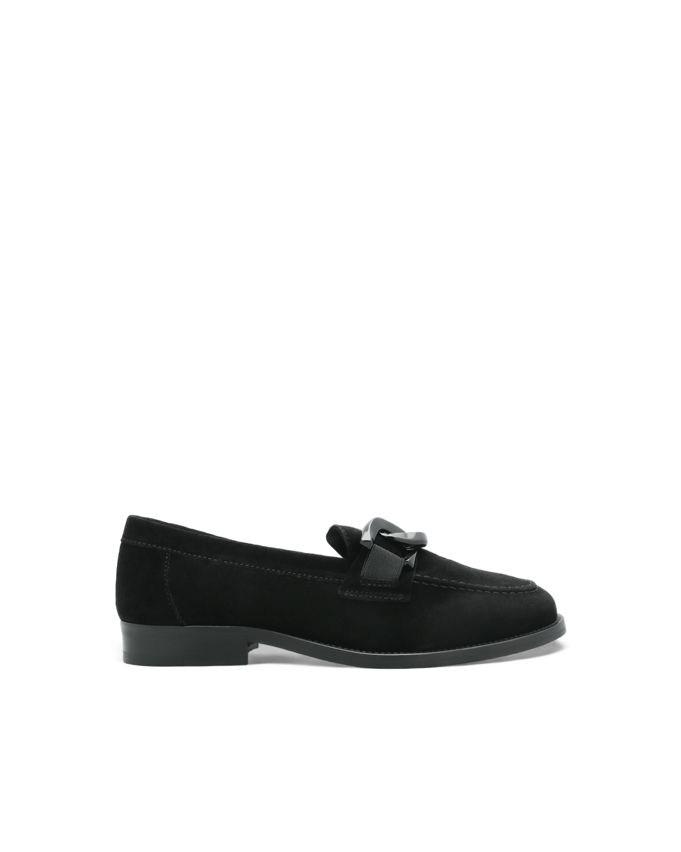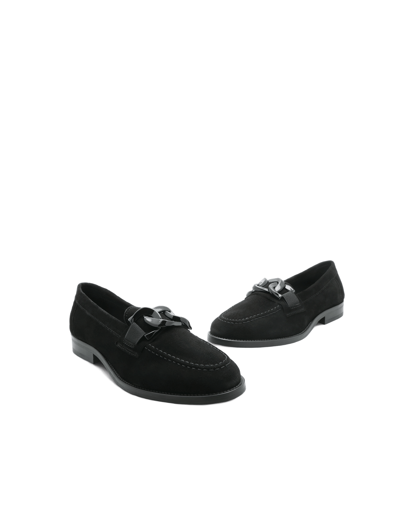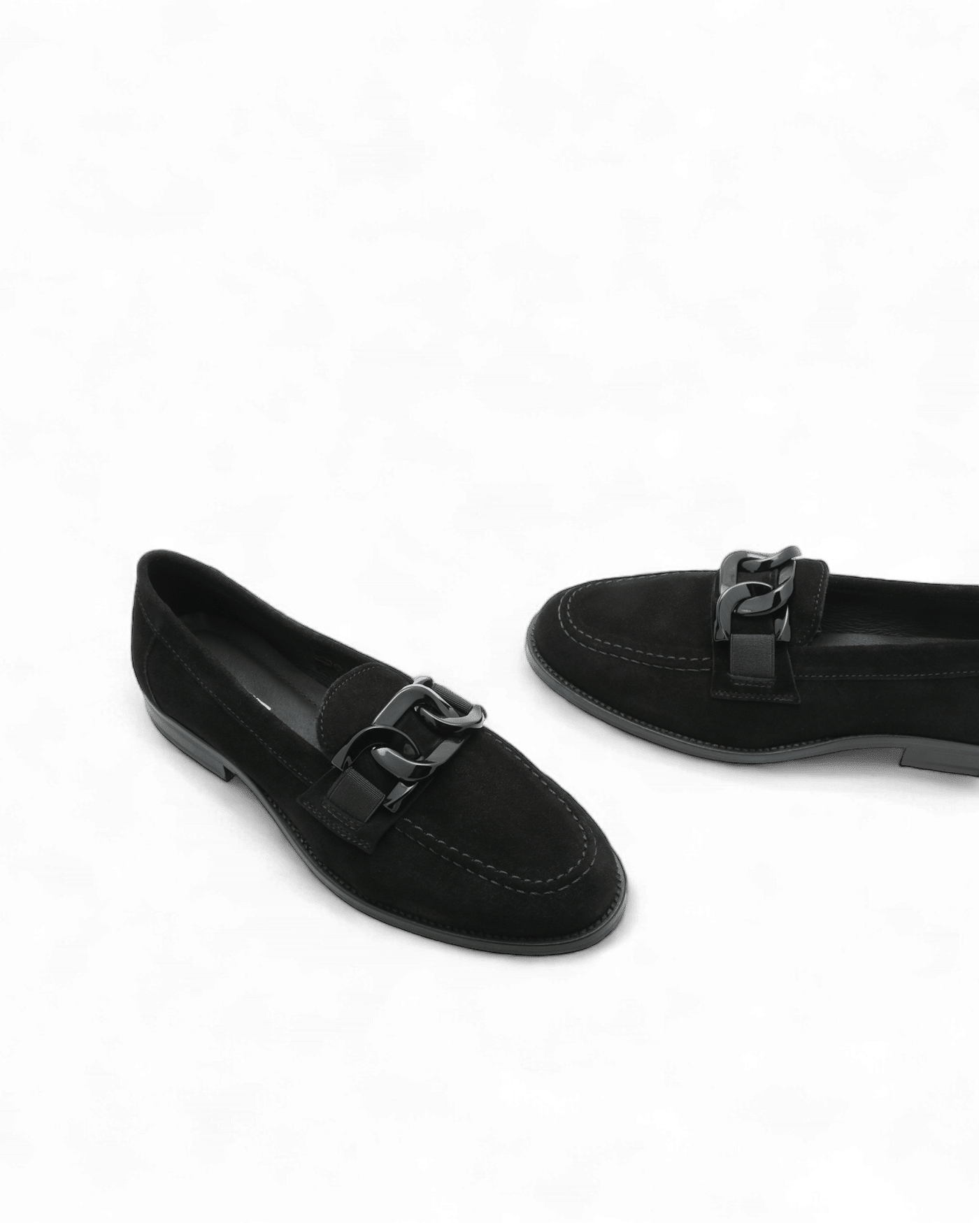 Découvrez notre mocassin daim noir femme Evian, en cuir velours. Un modèle de mocassin chic et intemporel, c’est un classique de l’automne pour une allure résolument élégante. Le mocassin en daim Evian est une chaussure au style classique, avec un bout rond et une jolie chaînette en métal qui vient décorer le dessus du pied.