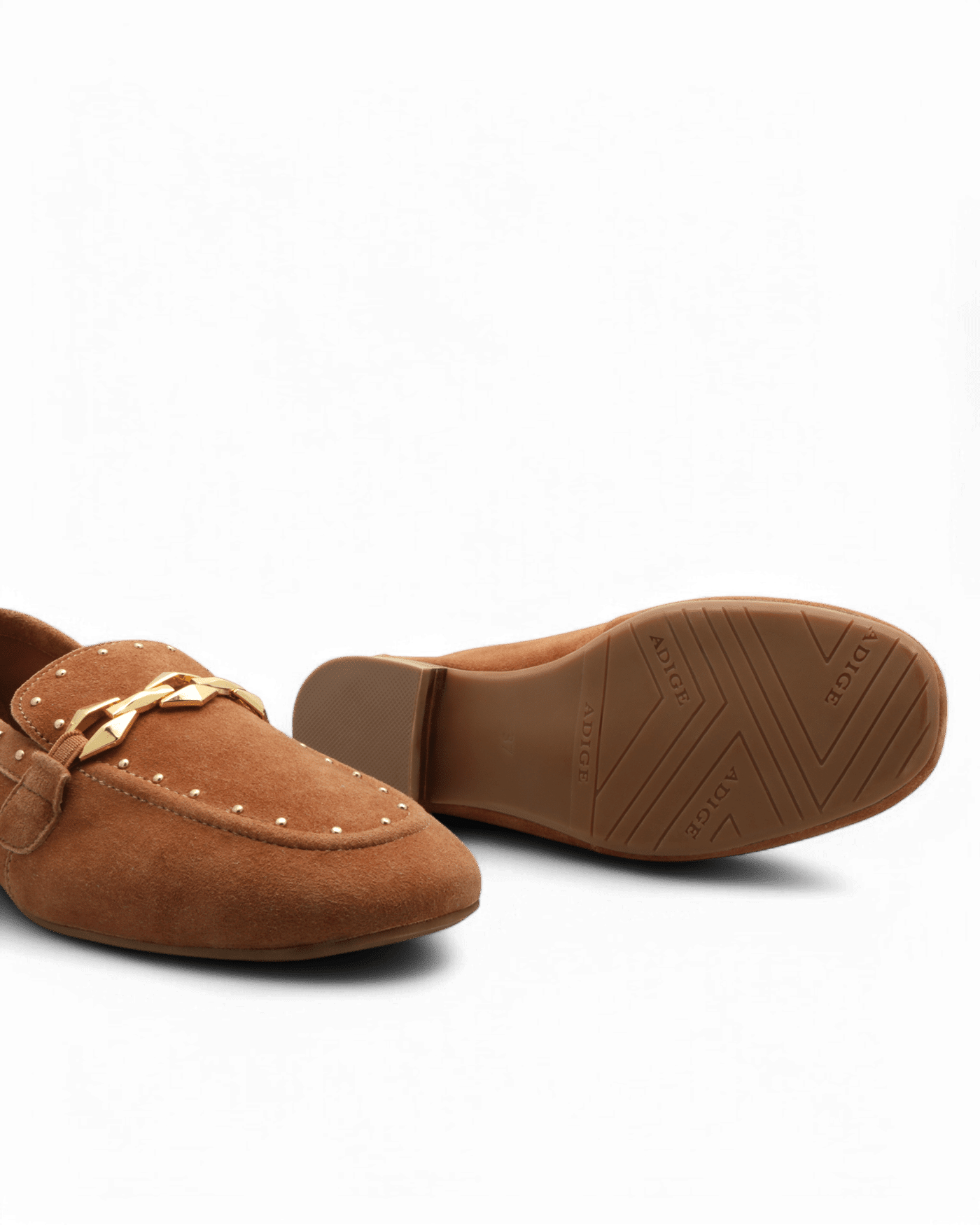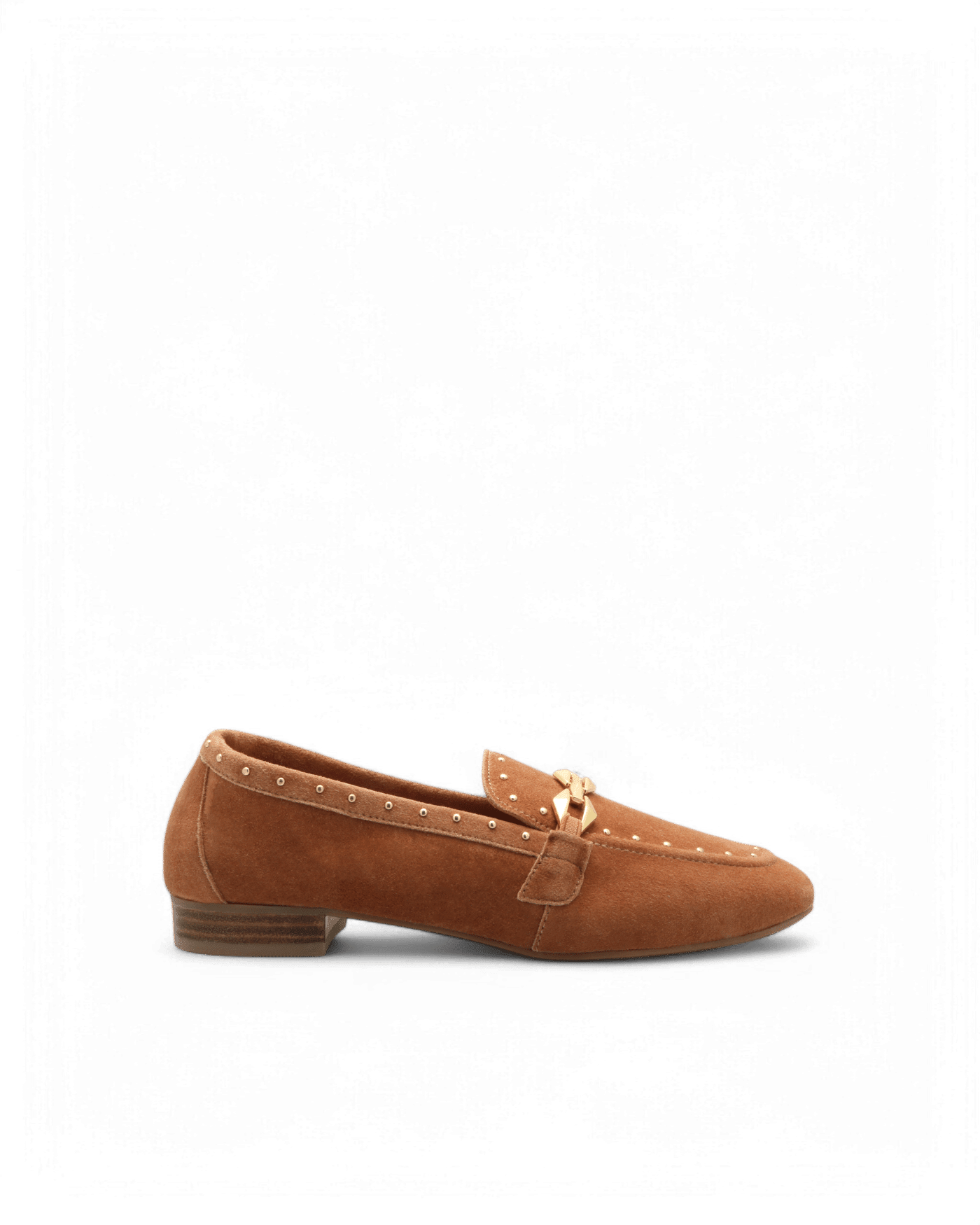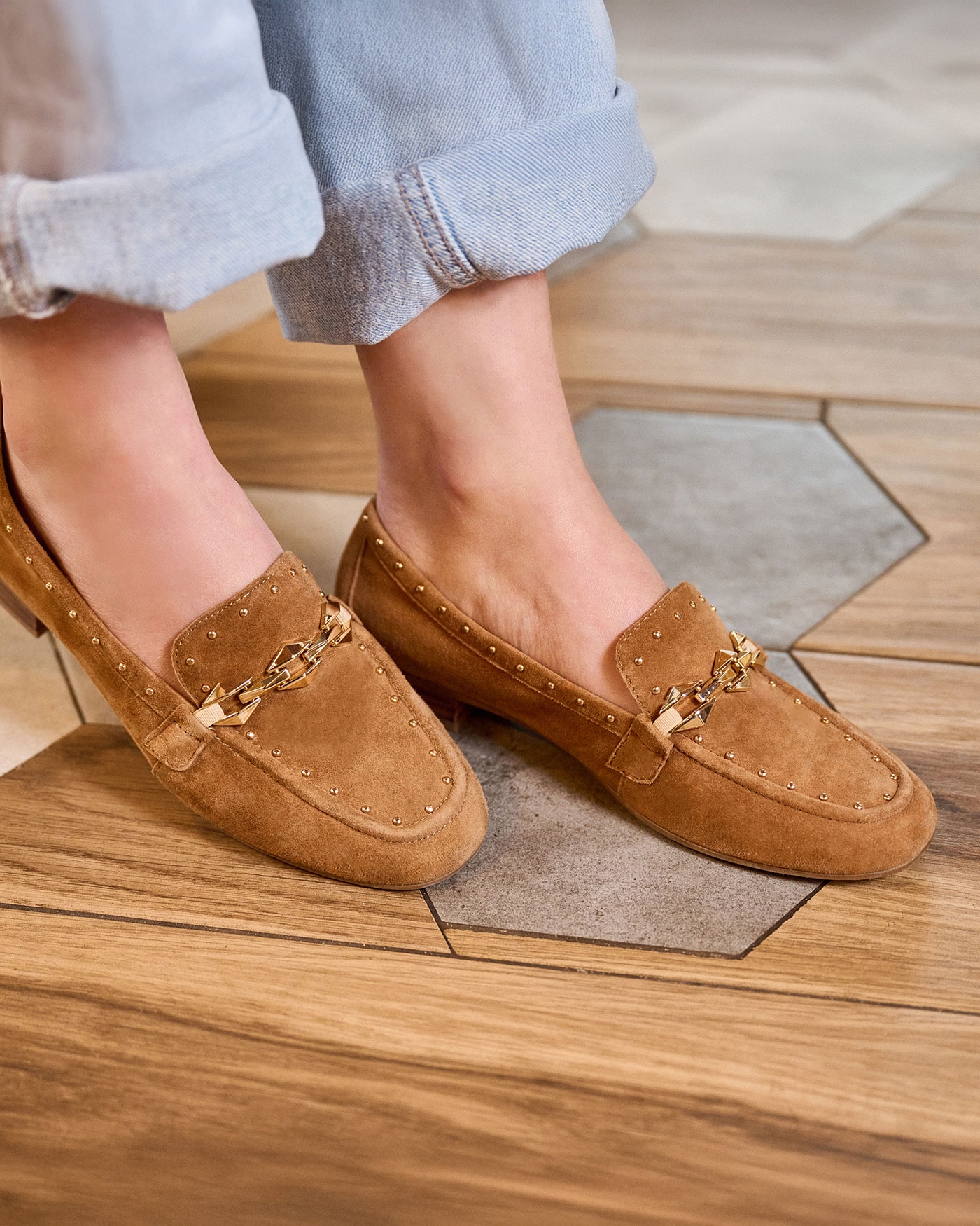 Avec son coloris havane, chaud et intemporel, il s’adapte facilement à toutes vos tenues, du look décontracté au plus élégant. Il se marie aussi bien avec une robe fluide, un jean ou une jupe midi. Le daim apporte une douceur incomparable, tandis que la teinte havane donne à ces mocassins un côté à la fois chic et naturel. Les finitions soignées, comme les clous dorés et la petite chaînette sur le dessus du pied, apportent une touche de sophistication à cette pièce classique.