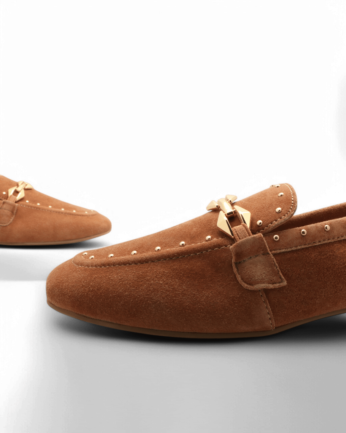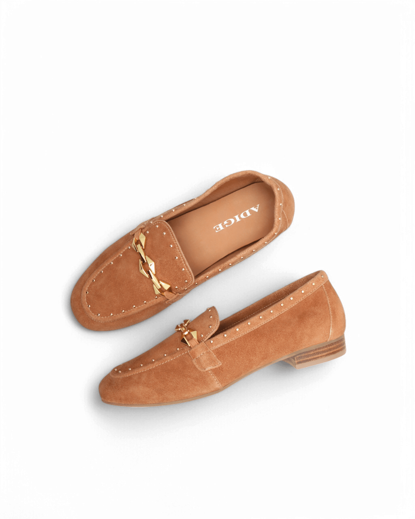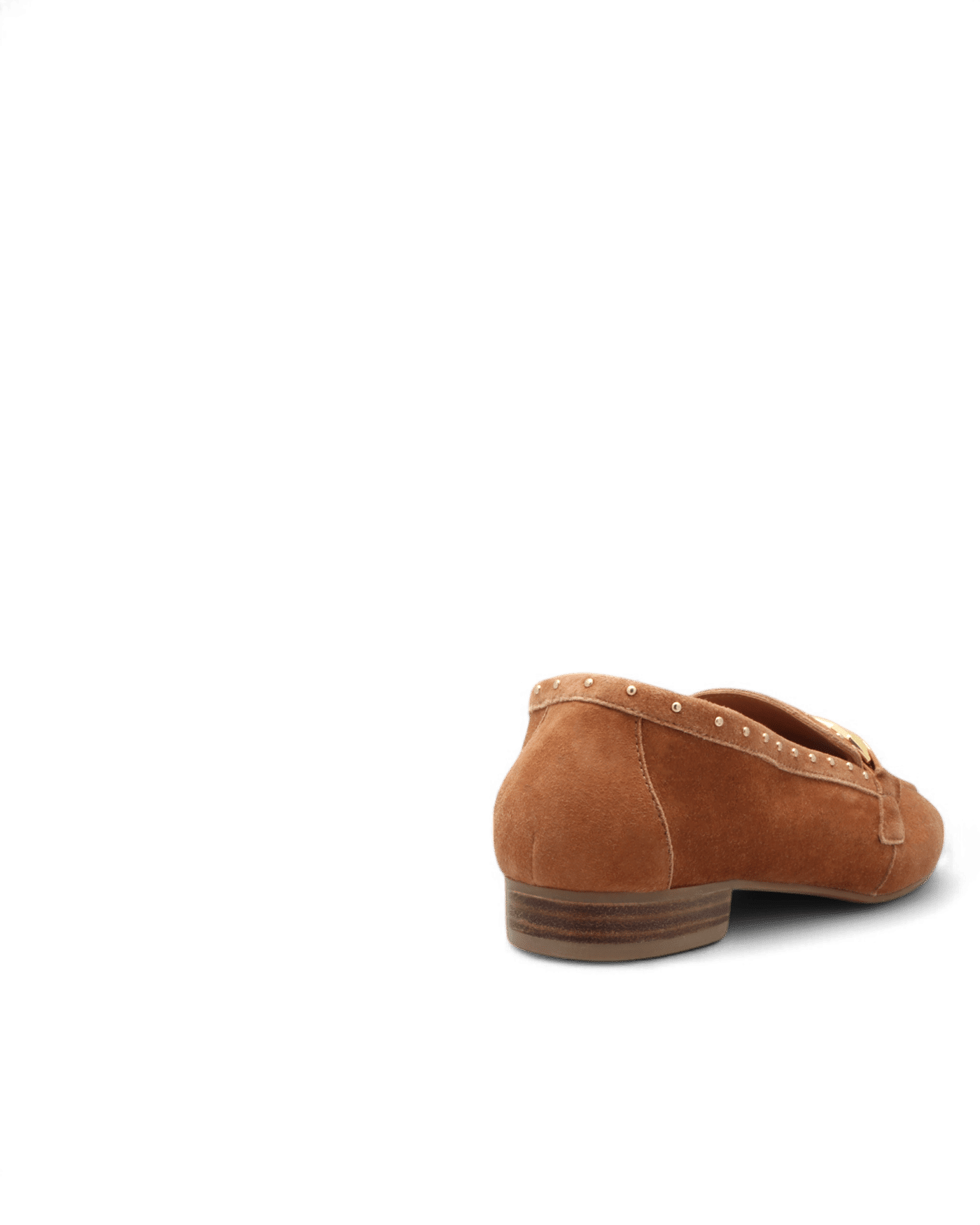 Avec son coloris havane, chaud et intemporel, il s’adapte facilement à toutes vos tenues, du look décontracté au plus élégant. Il se marie aussi bien avec une robe fluide, un jean ou une jupe midi. Le daim apporte une douceur incomparable, tandis que la teinte havane donne à ces mocassins un côté à la fois chic et naturel. Les finitions soignées, comme les clous dorés et la petite chaînette sur le dessus du pied, apportent une touche de sophistication à cette pièce classique.