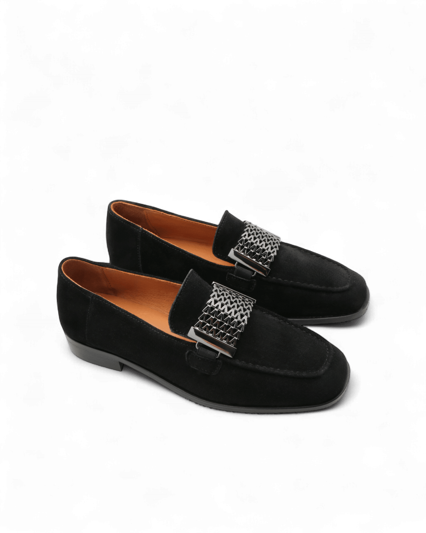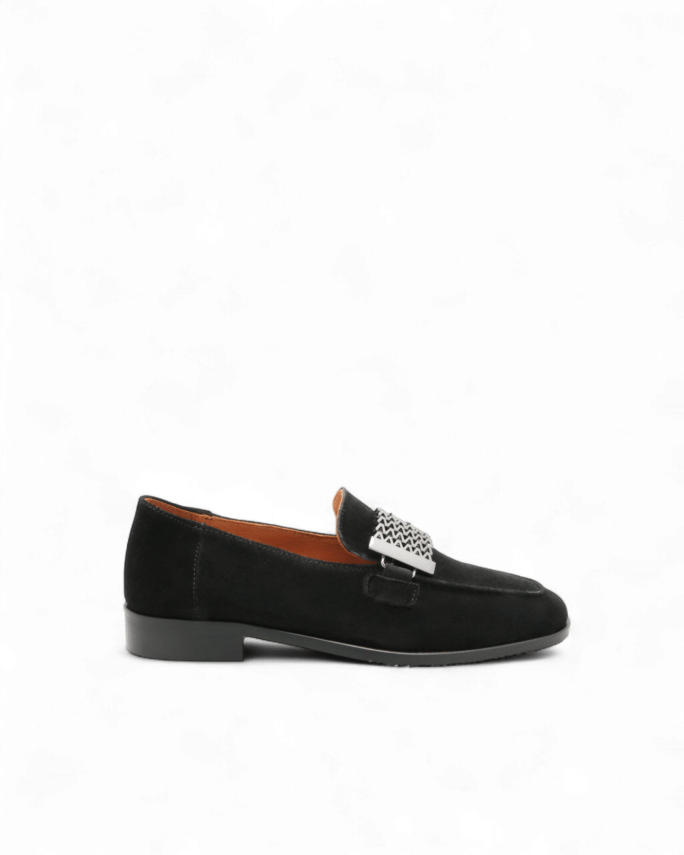 Réalisé en cuir suédé noir, ce mocassin séduit par sa texture douce et sa teinte profonde, facile à marier avec l’ensemble du vestiaire féminin. Sa ligne épurée est modernisée par un large ornement métallique effet maille, placé sur le dessus du pied. Ce détail subtil donne du relief à la silhouette sans jamais alourdir l’allure.
