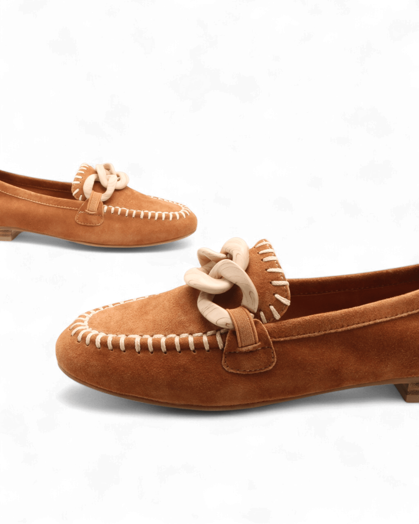 Sur le dessus, une chaîne à trois maillons en matière claire effet bois tressé apporte une touche originale et contemporaine, subtilement intégrée au design intemporel du modèle. Cette ornementation chic, à la fois discrète et distinctive, accentue le style raffiné du mocassin.