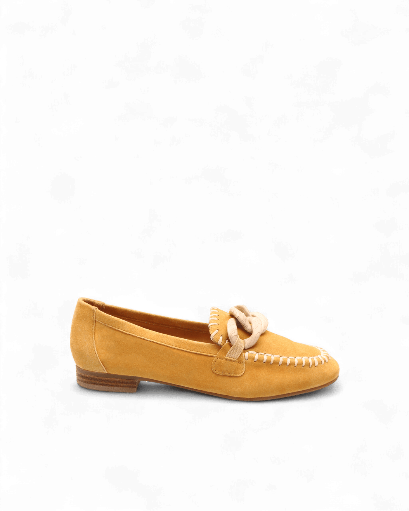 Confectionné en cuir velours, ce mocassin séduit par sa matière douce et son coloris jaune lumineux. La doublure et la semelle intérieure en cuir assurent un confort supérieur tout au long de la journée. En complément, la semelle extérieure en gomme garantit souplesse et stabilité à chaque pas.